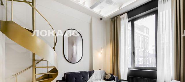 Уникальный апартамент в ЖК Loftec, реализованный по проекту известного архитектурного бюро с дорогим ремонтом. Вид из окна в сторону внутреннего двора, нет здания напротив. Два уровня, на первом санузен и зона кухни-гостиной, на втором уровне расположена кровать. Обращаю ваше внимание что высота потолка на втором уровне 1,73!