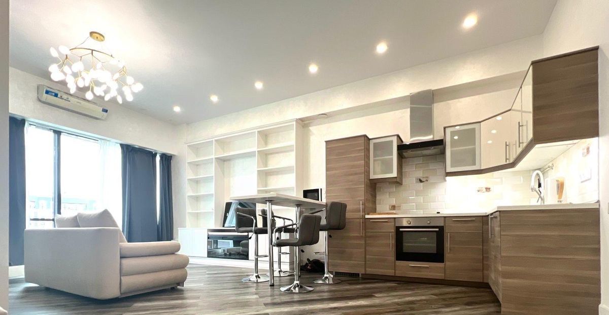 Сдаётся стильный апартамент в Москве на Нижней Красносельской улице, всего в 5 минутах пешком от метро Бауманская. Общая площадь — 53 кв. м, жилая — 30 кв. м, кухня — 10 кв. м. Апартамент расположен на 7 этаже 10-этажного монолитного дома, построенного в 2015 году. Высота потолков впечатляет — 3.3 метра.