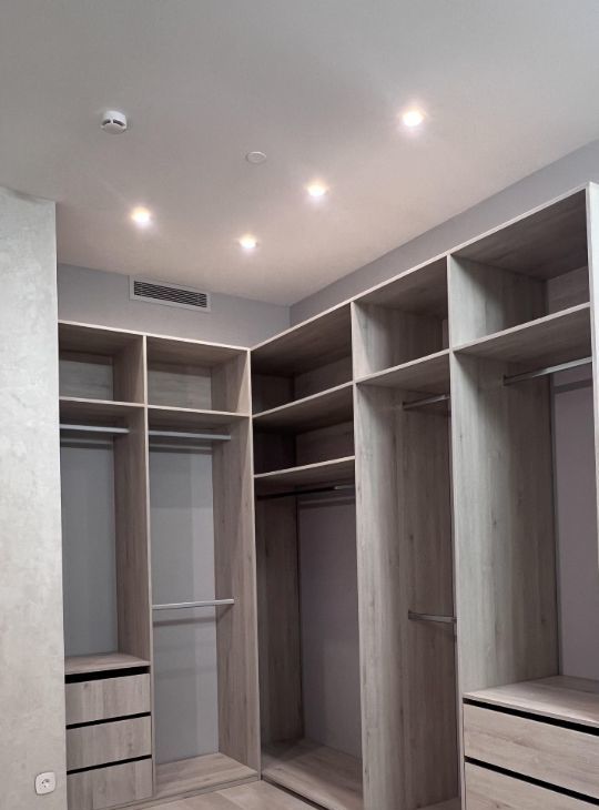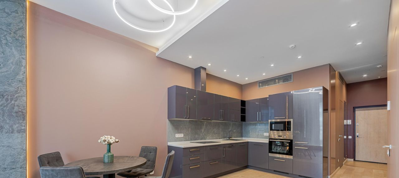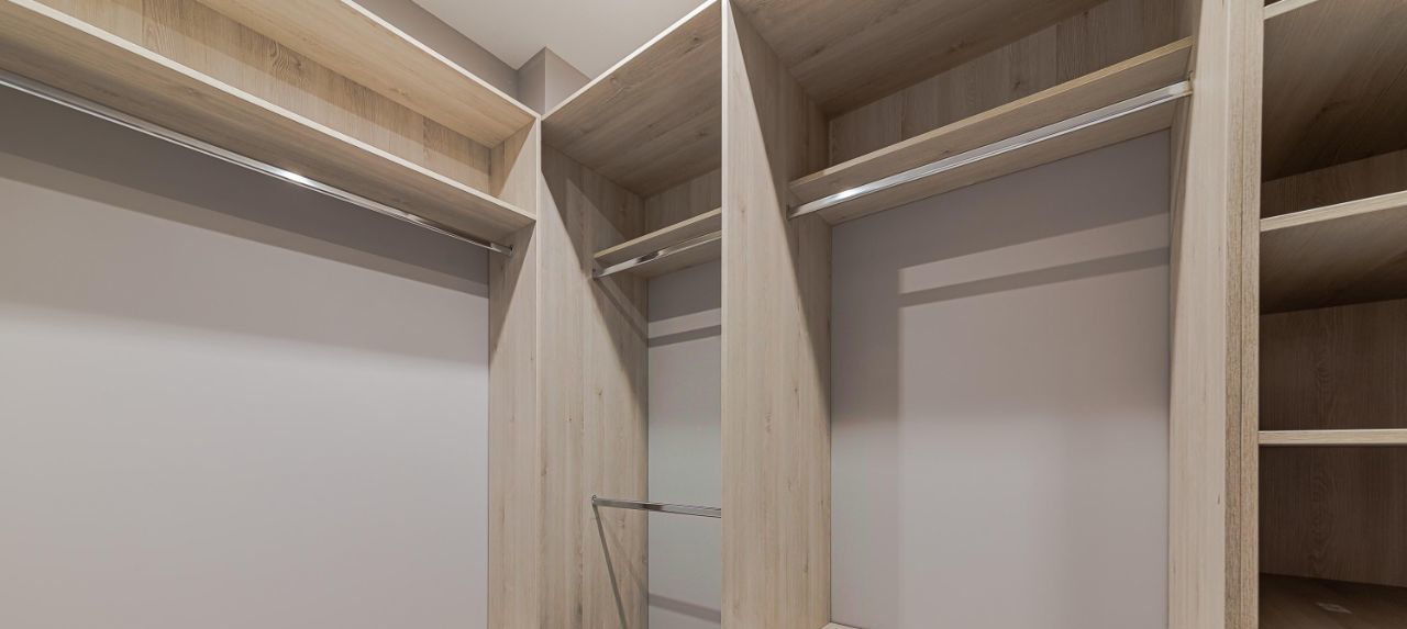 Планировочное решение включает кухню с гостиной, где могут оставаться гости, спальня с просторной открытой гардеробной, совмещенный санузел с зоной для стирки белья, отдельная гардеробная комната при входе.