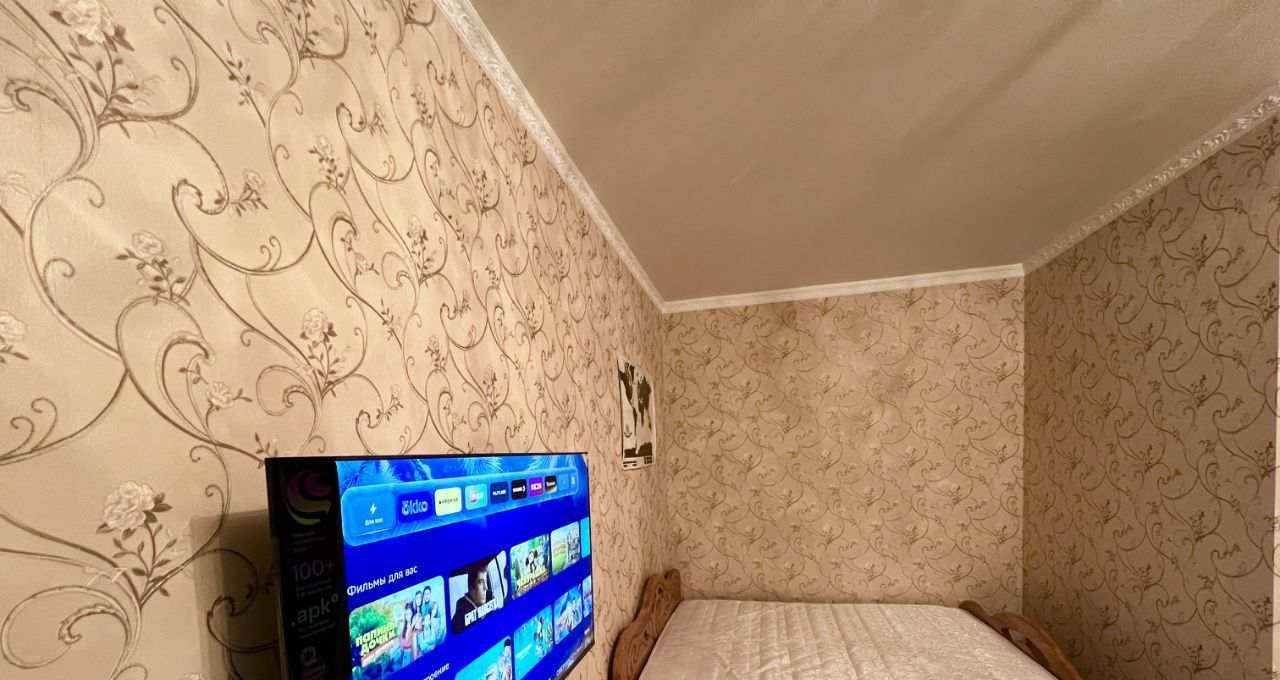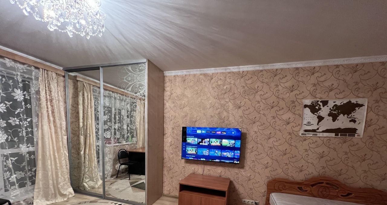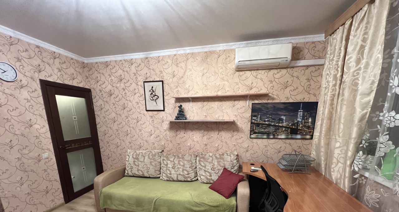 Комната: большой встроенный шкаф, двуспальная кровать, диван, новый телевизор, кондиционер, удобный компьютерный стол, офисный стул.