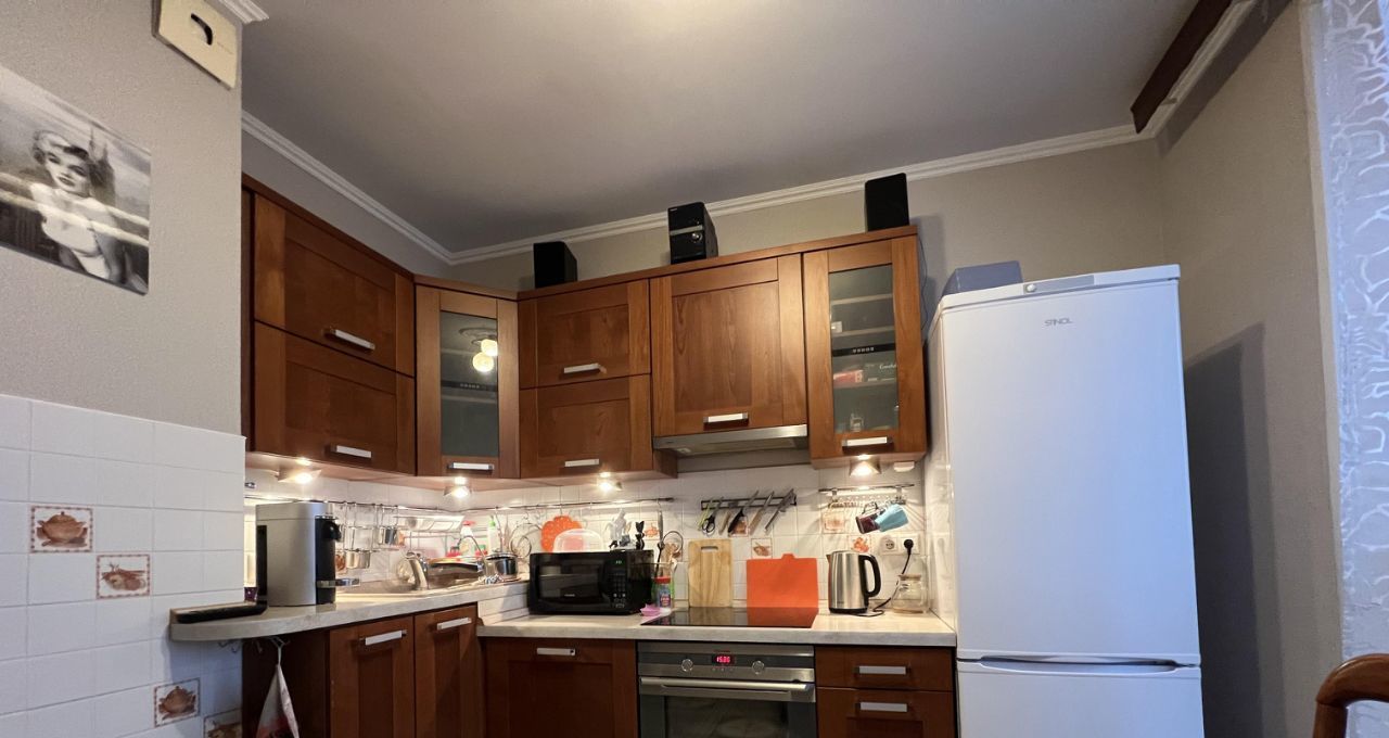 Кухня: кухонный гарнитур, стол, духовой шкаф, варочная индукционная панель, микроволновая печь, новый холодильник, посудомоечная машина, кофемашина.