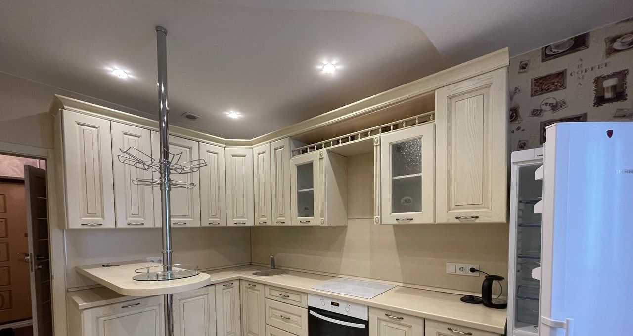 Есть всё необходимое для комфортного проживания: холодильник, телевизор, стиральная машина. Кухня из массива с барной стойкой.