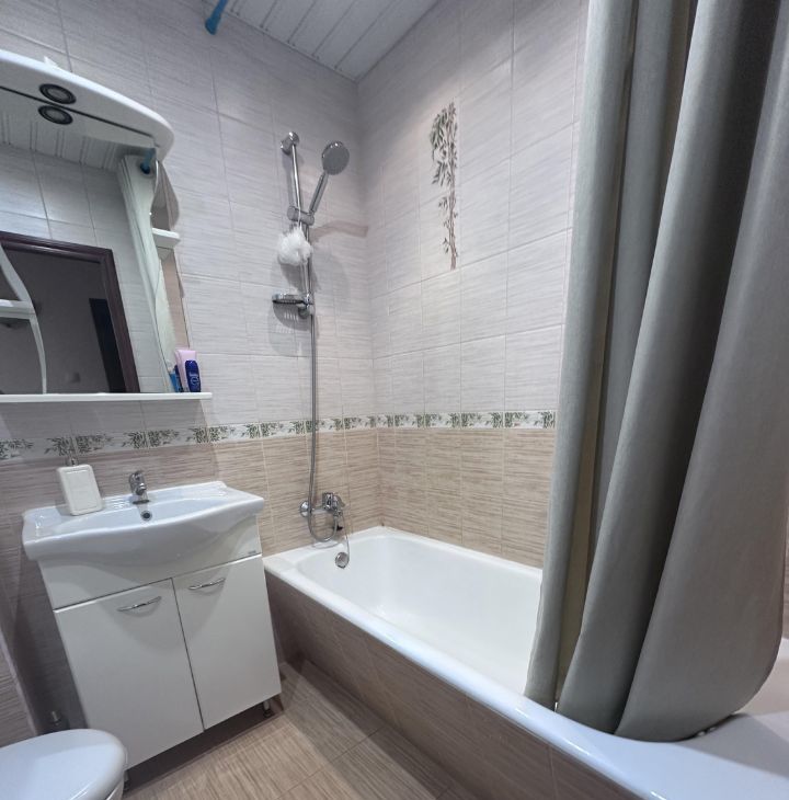 Квартира с евроремонтом, полностью готова для комфортного проживания. В комнате и на кухне есть вся необходимая мебель. Из техники: холодильник, телевизор и стиральная машина, микроволновая печь, электрический чайник. Окна выходят во двор, что обеспечивает тишину и уют в квартире, есть балкон.