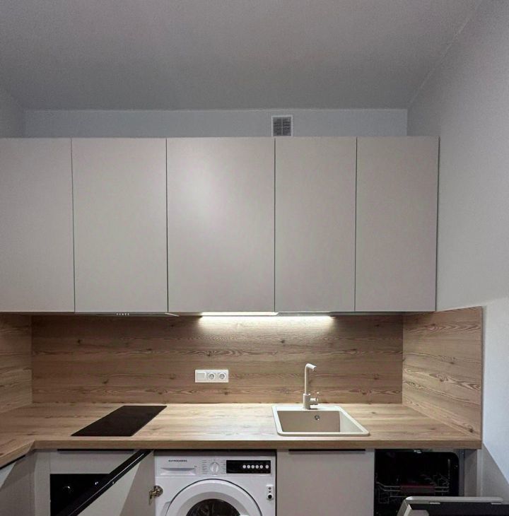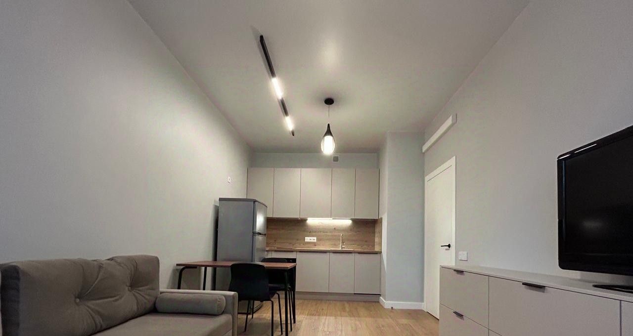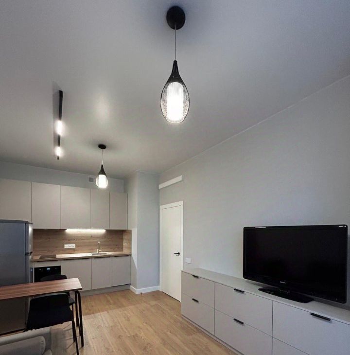 В кухне-гостиной - встроенная кухня (включая варочную панель, духовой шкаф, посудомоечную и стиральную машину), холодильник, удобный диван, вместительная корпусная мебель для хранения, телевизор.