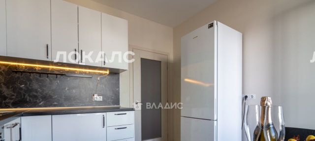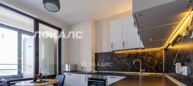 изолированная кухонная зона c обеденной группой у выхода на лоджию с панорамными окнами, оснащена холодильником, варочной панелью, духовым шкафом, СВЧ-печью, стиральной машиной;