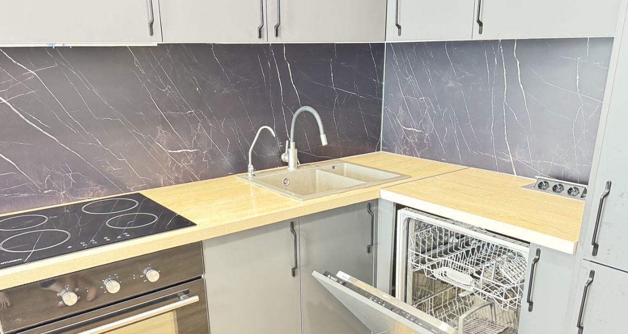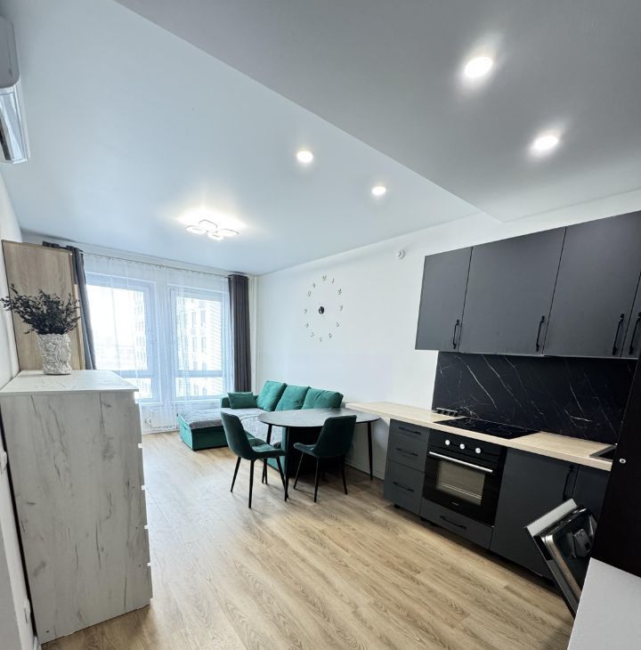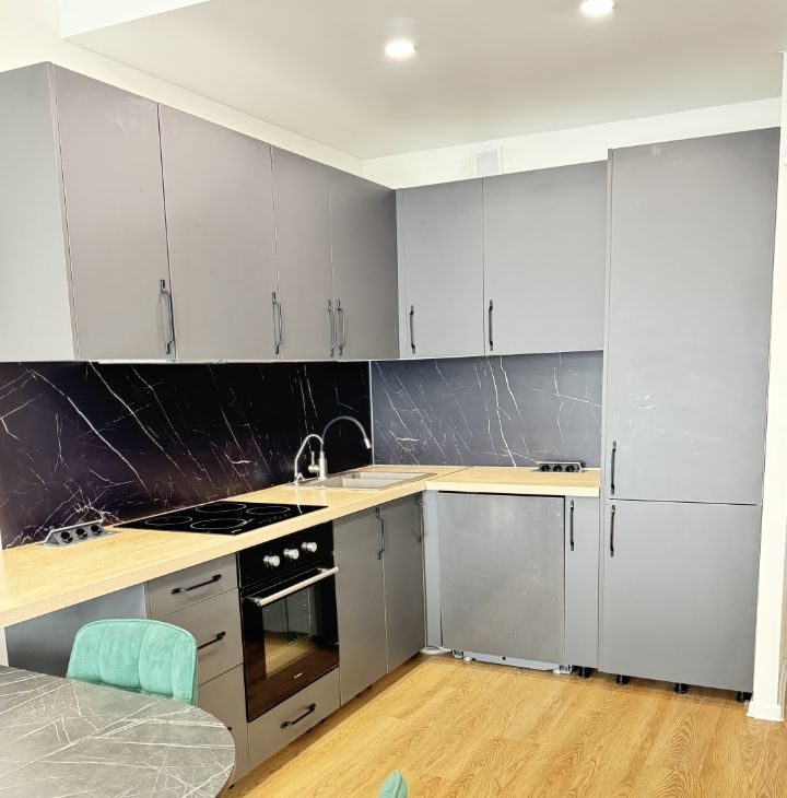 Удобная кухня-гостиная: кухонный гарнитур, фильтр с питьевой водой, индукционная варочная панель, духовой шкаф, посудомоечная машина Bosch 60см, раскладной диван с ортопедическим основанием, телевизор, кондиционер