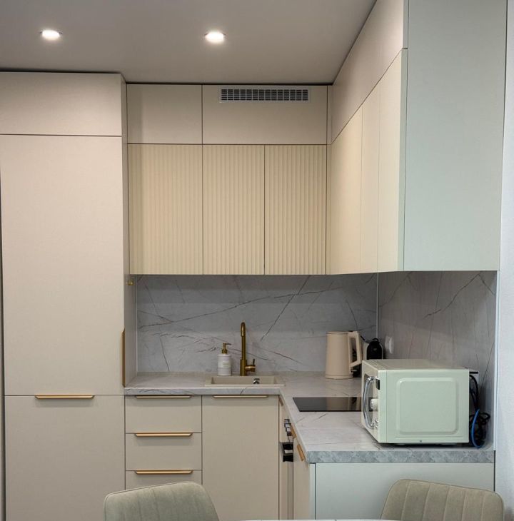 Просторная кухня-гостиная оснащена всей необходимой техникой: холодильник, телевизор, микроволновая печь, вытяжка, варочная панель и духовой шкаф, посудомоечная машина, чайник, кофемашина.