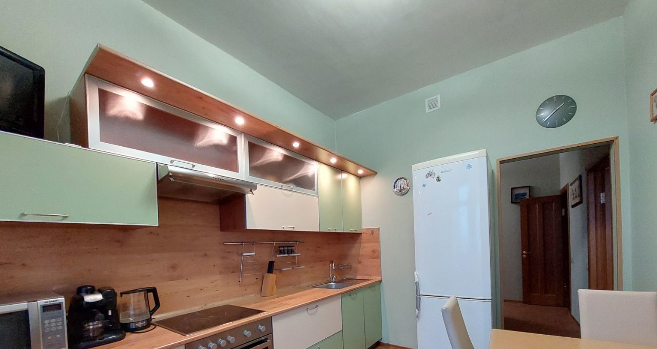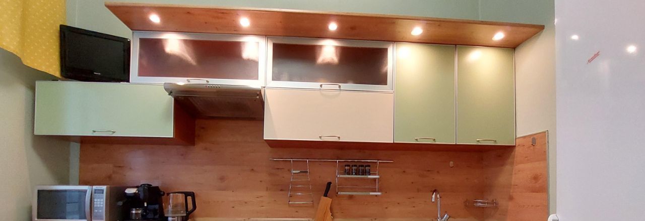 * В кухне 10 м2- встроенный кухонный гарнитур, плита-стеклокерамика, СВЧ, кофеварка, электрочайник, небольшой ТВ , 2-х камерный холодильник, обеденная группа, гостевой диван (раскладывается).