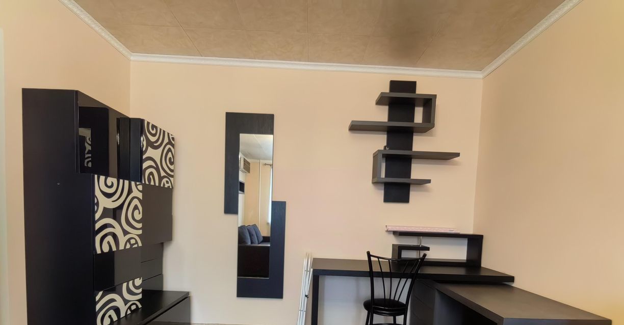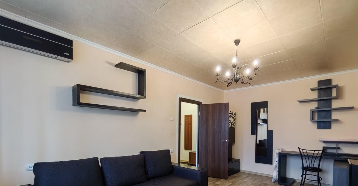 Шкаф-купе и комод/скамья под обувь в коридоре. Комната: кондиционер, письменный стол + полки + стул (рабочая зона), зона под ТV с подвесными полками, диван (раскладной, 2 - х спальный). Кухня: кондиционер, столовая группа (стол обеденный + стулья), СВЧ - печь, холодильник, электрическая плита, санузел: стиральная машина, ванная.