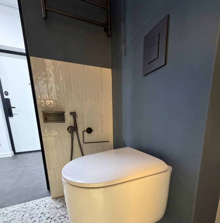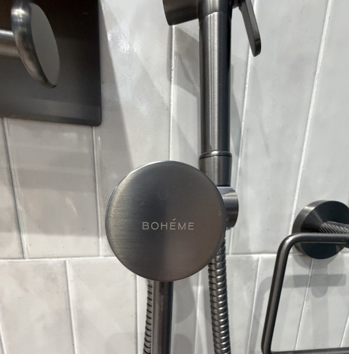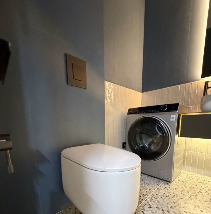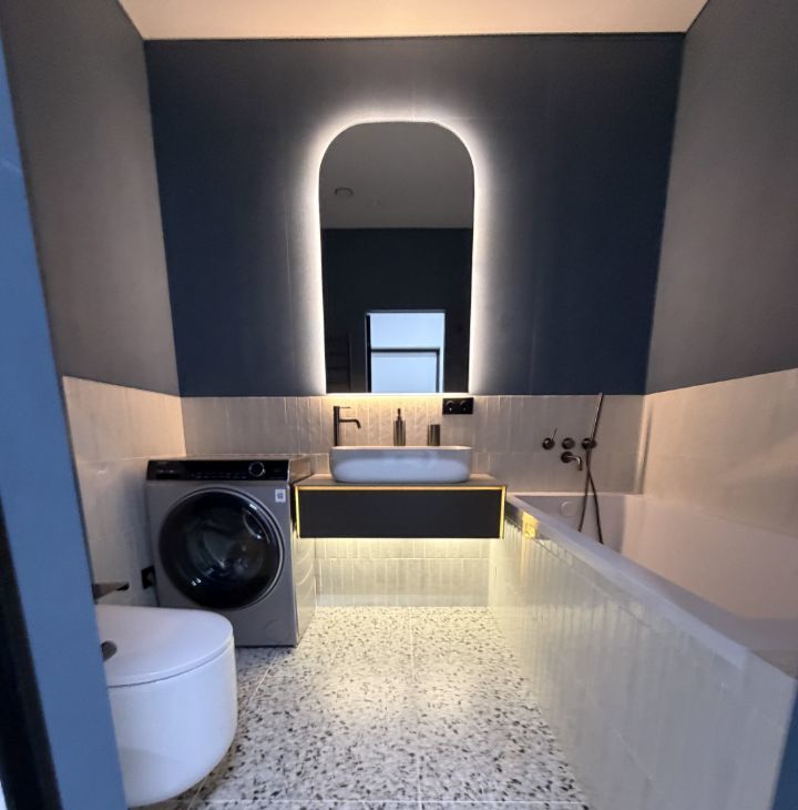 В ванной комнате установлена дорогая сантехника: установлен проточный водонагреватель, полноценная ванна из белого матового камня, унитаз Boheme со встроенной инсталляцией, гигиенический душ Boheme, стиральная машина Xaier hw80-bp14979s, подвесная тумба с выдвижным ящиком и автоматической подсветкой с датчиком движения, зеркало с подсветкой холодный-теплый-нейтральный свет.