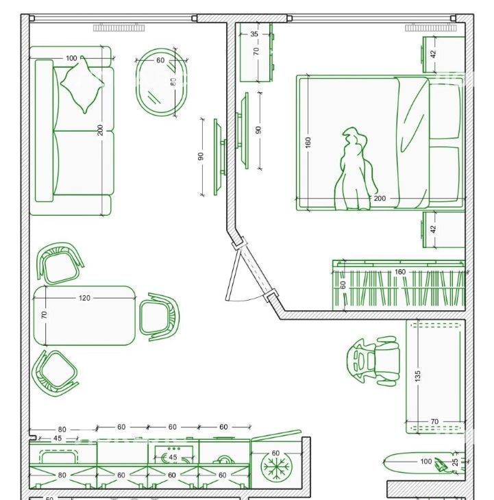 В спальне есть кровать 160-200 с прикроватными тумбочками.