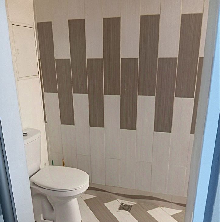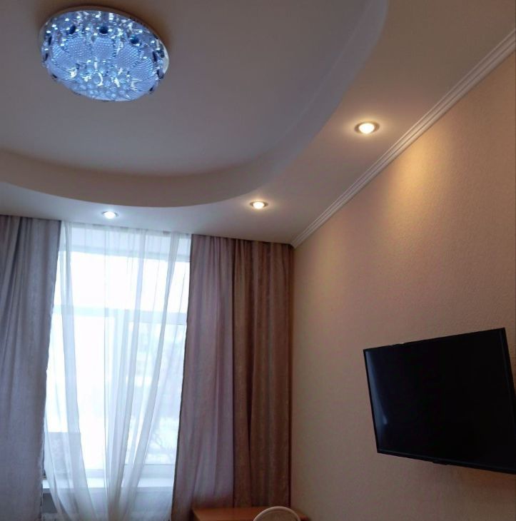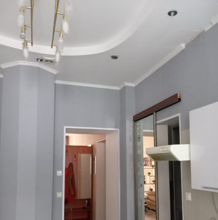 Полы : кухня и с/у с подогревом, комната ламинат, стеклопакеты ( пластик) , многоуровневые потолки с подсветкой, железная дверь, домофон.