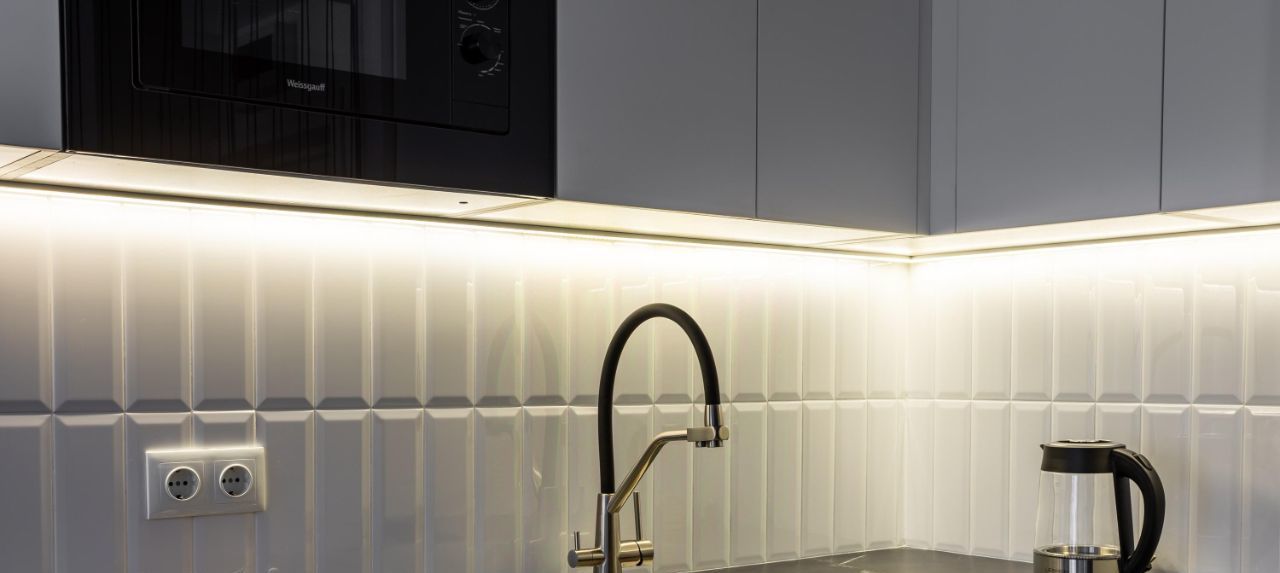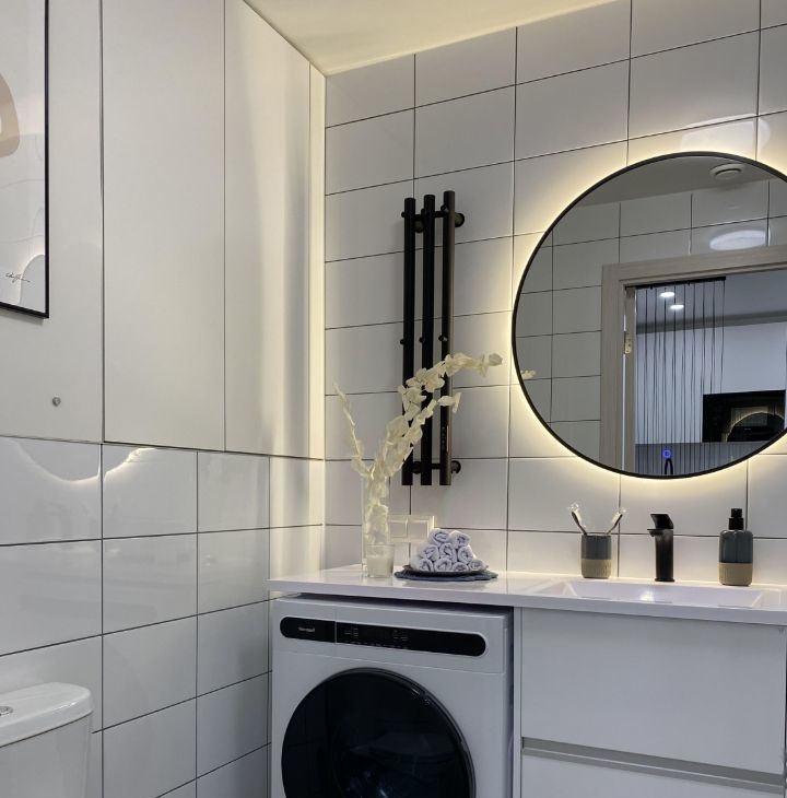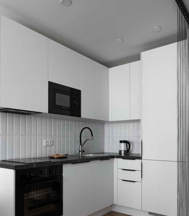 Вся техника встроенная. Вместительный холодильник, посудомоечная машина 45 см, духовой шкаф, стирально-сушильная машина, СВЧ-печь.