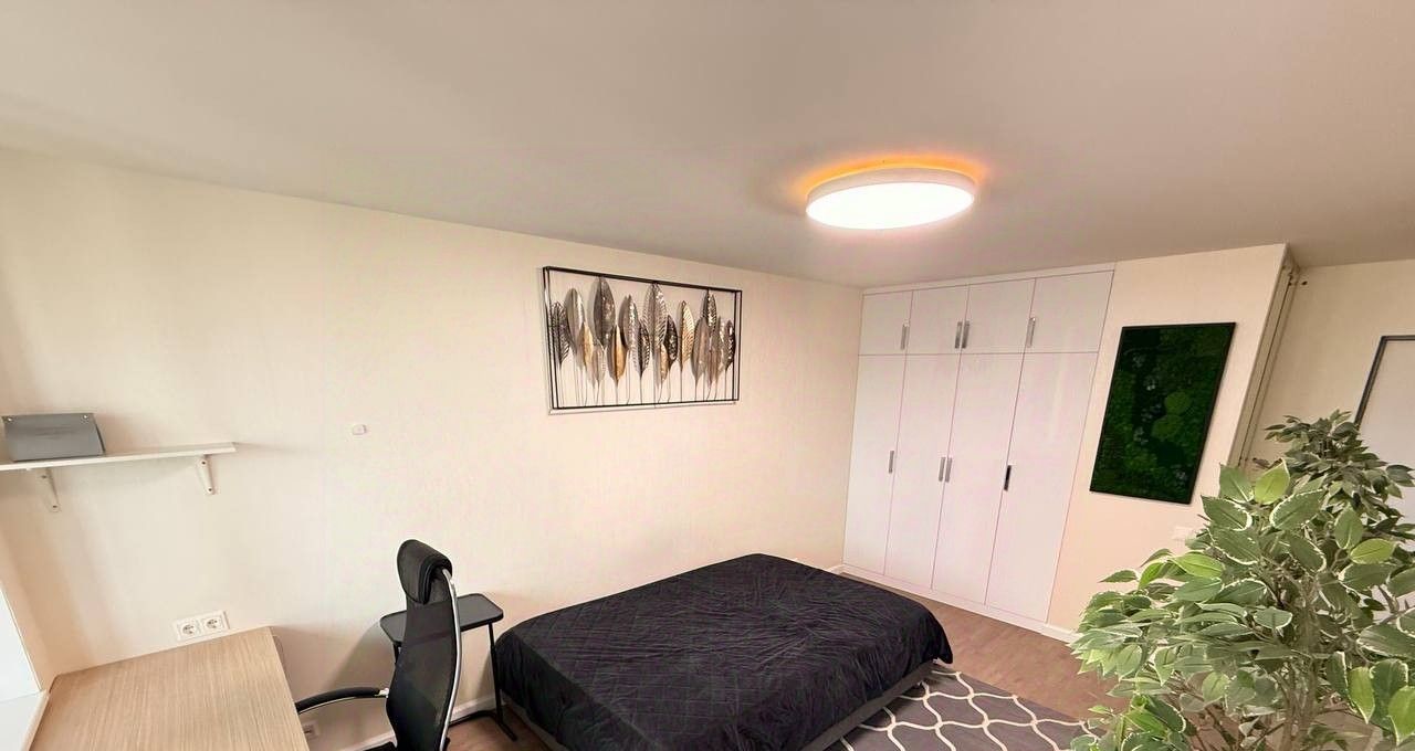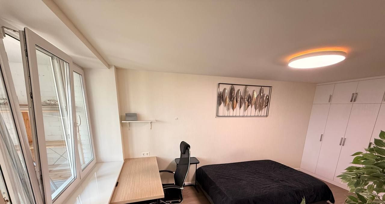 В спальне: двуспальный кровать. Вместительный шкаф. Телевизор. Рабочий стол.