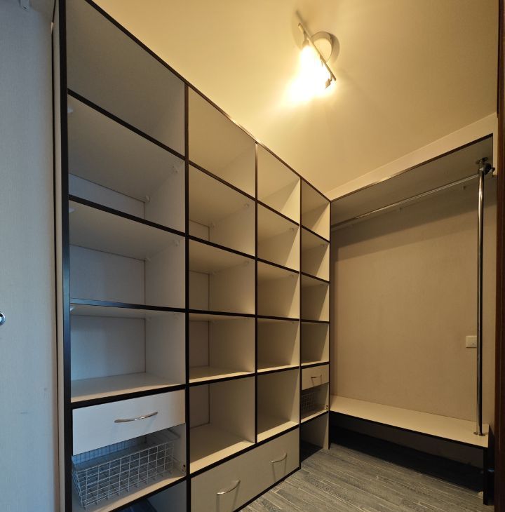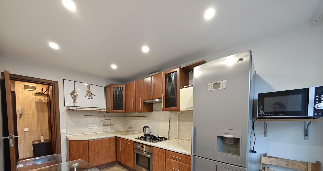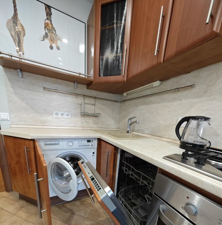 Квартира оснащена всей необходимой современной мебелью и техникой: кондиционер, встроенные посудомоечная и стиральная машины, варочная панель и духовой шкаф, микроволновка, холодильник с морозильной камерой, оснащенный встроенным кулером для холодных напитков, телевизор, сейф. Большая кухня. Вместительная удобная гардеробная с огромными зеркальными дверями. Комфортная двуспальная кровать с подъемным механизмом для хранения вещей.