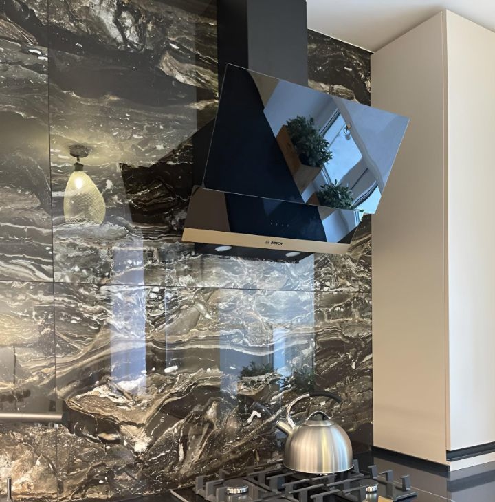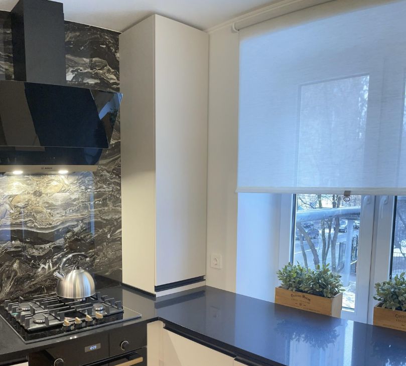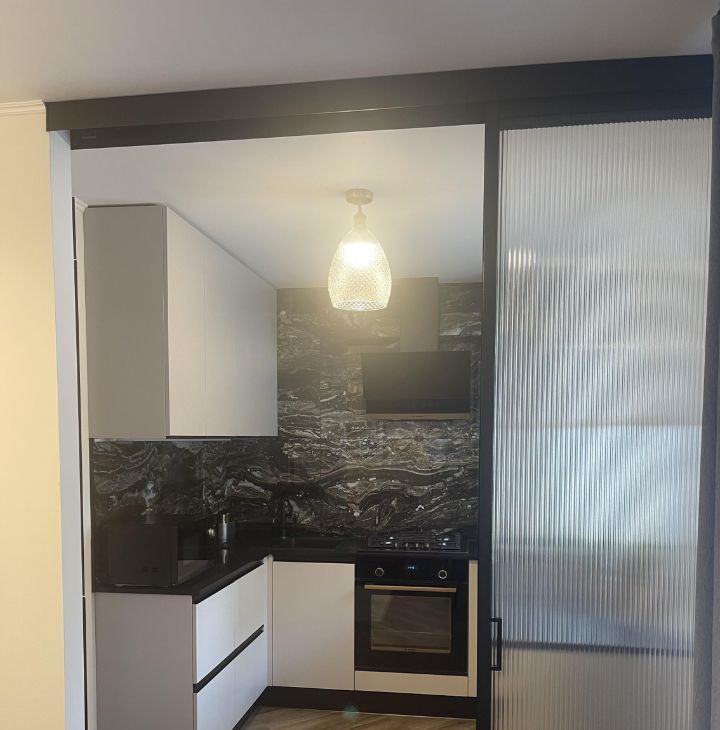 - на кухне встроенный кухонный гарнитур со столешницей из кварцевого агломерата;