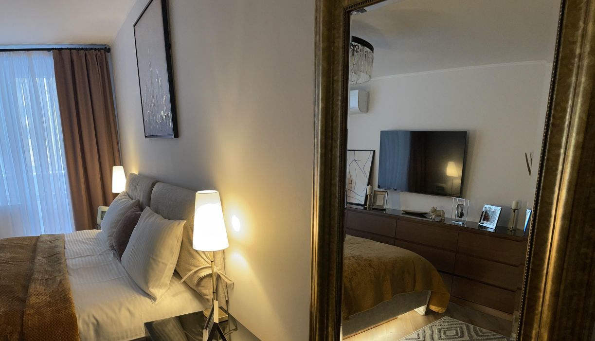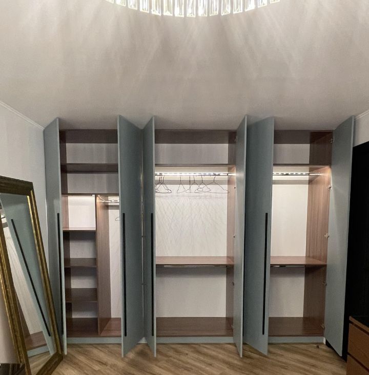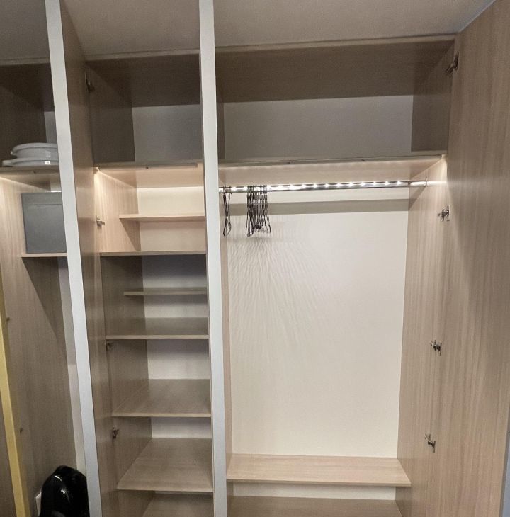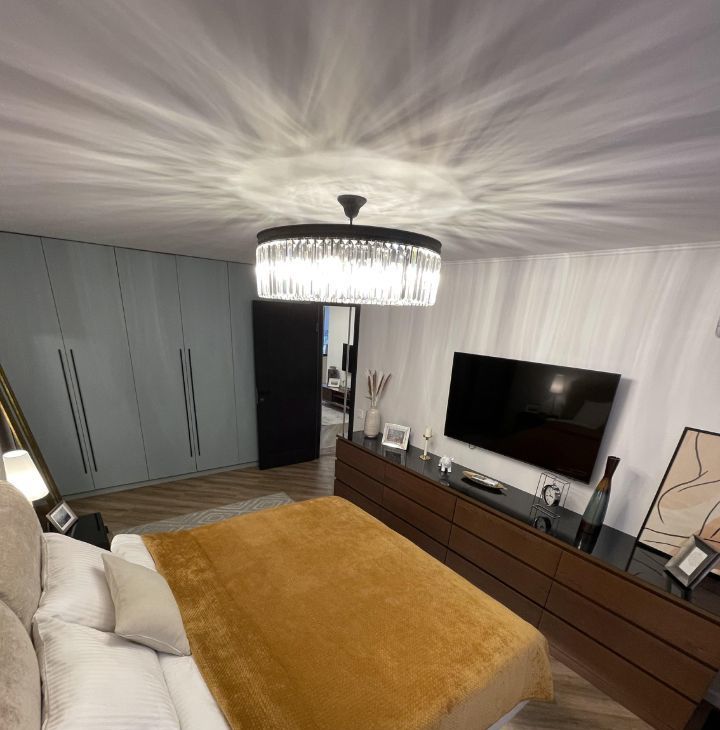 - большая кровать с подсветкой, ортопедический матрас Аскона, подъёмный механизм с дополнительным местом для хранения;