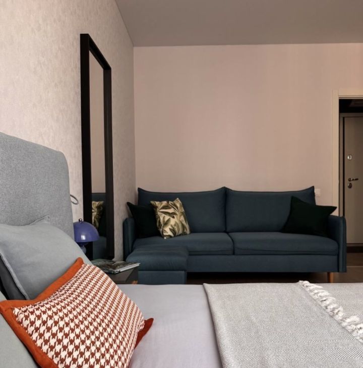 Для сна: комфортная кровать queen size с ортопедическим матрасом (160x200). Для гостей: раскладывающийся двуспальный диван. И ещё: утепленная лоджия с теплым полом, раздельный санузел, продуманное и вместительное хранение вещей, встроенная гладильная доска, рабочий стол.