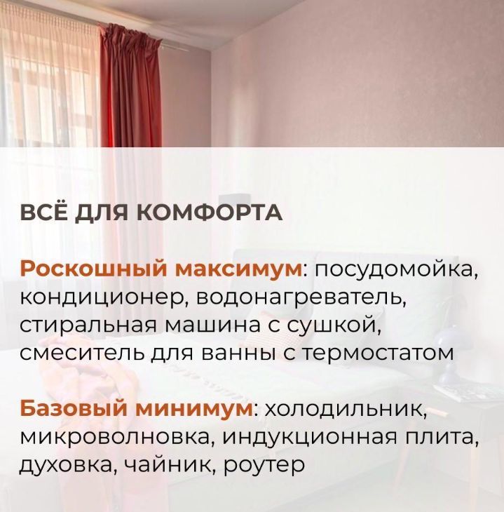 В квартире есть все необходимое для комфортного проживания. Роскошный максимум: посудомойка, кондиционер, водонагреватель, стиральная машина с сушкой, смеситель для ванны с термостатом. Базовый минимум: холодильник, микроволновка, индукционная плита, духовка, чайник, роутер.