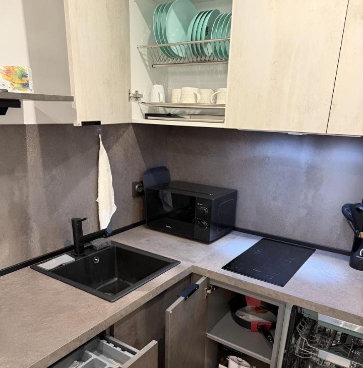 Кухня оборудована всей необходимой техникой - холодильник, варочная панель, вытяжка, посудомойка, электрический чайник, микроволновка, стоит система фильтрации воды. На кухне располагается большой двухспальный диван с ящиками для белья, есть вся необходимая посуда. Установлен кондиционер.