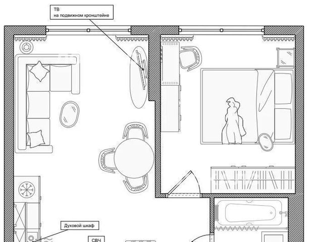 Бытoвая тexника: кондициoнep, поcудомоeчная машинa, вapoчнaя панель,духовой шкаф, микроволновая печь, холодильник, электрический чайник, стиральная машина, телевизор.