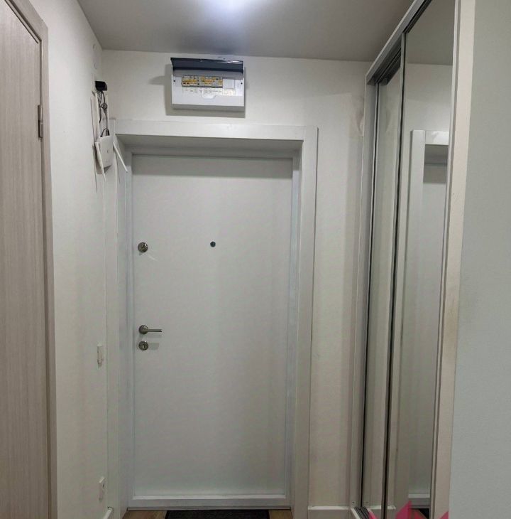 В коридоре большой и вместительный шкаф-купе с зеркальными дверцами.
