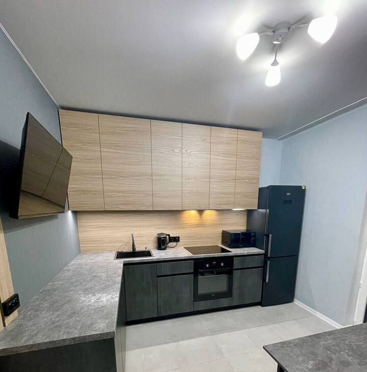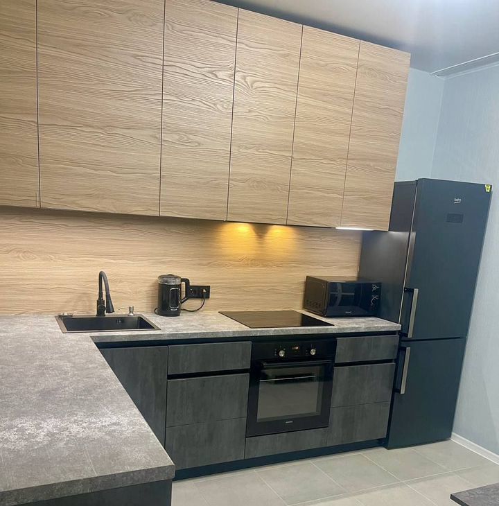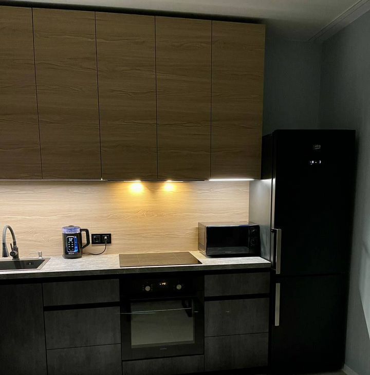 Просторная кухня с большой рабочей зоной — удобная столешница, продуманное хранение, современный гарнитур. Оснащение: варочная панель, духовой шкаф, холодильник, микроволновка, чайник.