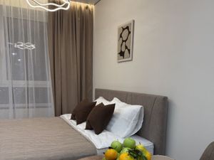 О КВАРТИРЕ: имеется все необходимое для красивой и комфортной жизни: большая полноценная дизайнерская кухня с окном; весь необходимый набор ультрасовременной бытовой техники (включая кондиционер, мощные бризер, проточный водонагреватель и очиститель питьевой воды). А двуспальная кровать с подьемным механизмом (артопедический матрас) и двуспальный раскладывающийся кожаный диван - дадут возможность комфортного размещения как самих жильцов, так и их гостей
