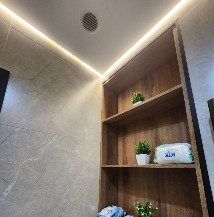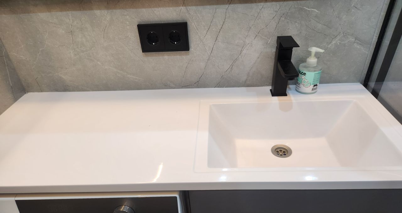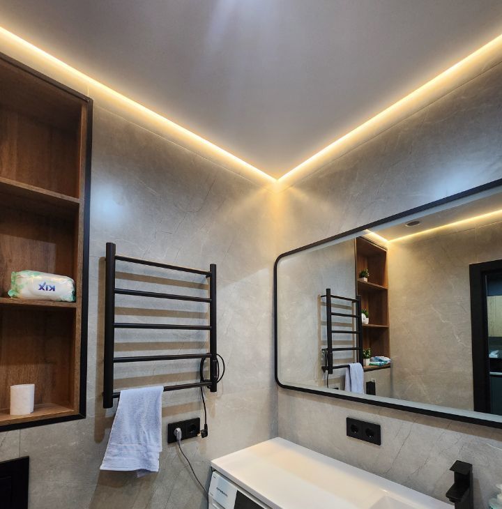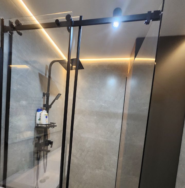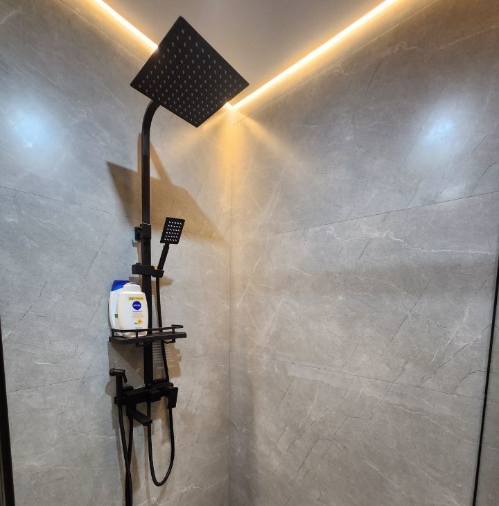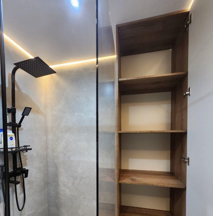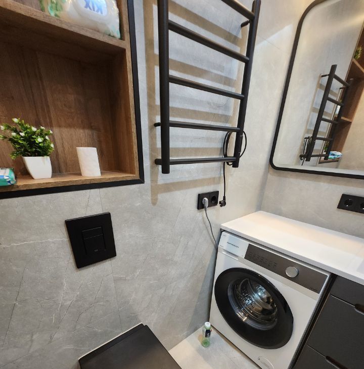 Санузел совмещённый, оборудован душевой кабиной с тропическим душем, стиральной машинкой и местами хранения.