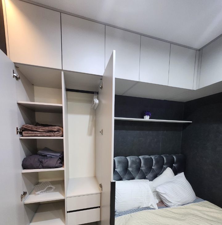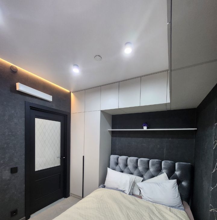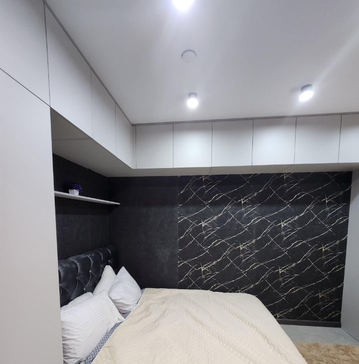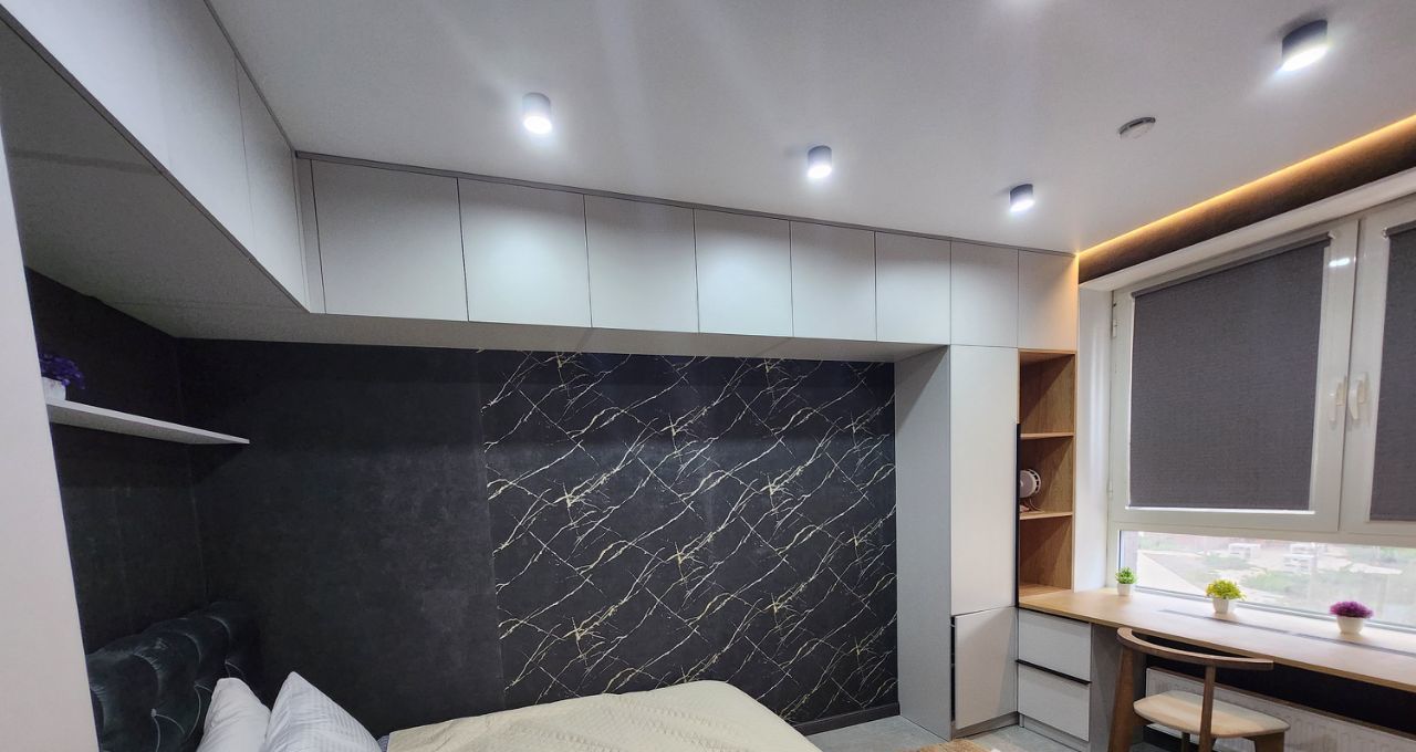 Спальня оборудована двуспальной кроватью, шкафами, местами хранения и рабочей зоной.