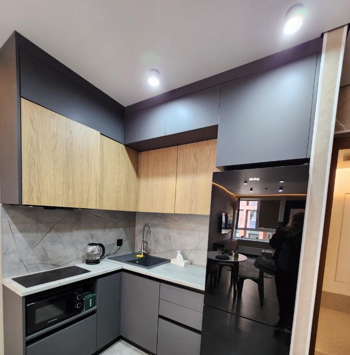 Современная кухня совмещена с просторной гостиной, в которой имеется все необходимое. Холодильник, фильтр для питьевой воды, варочная плита, СВЧ, чайник,