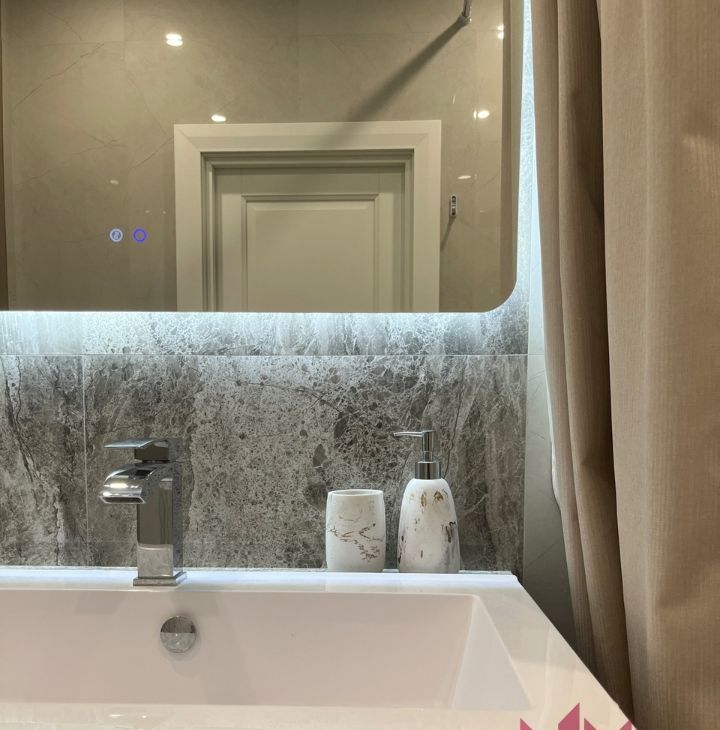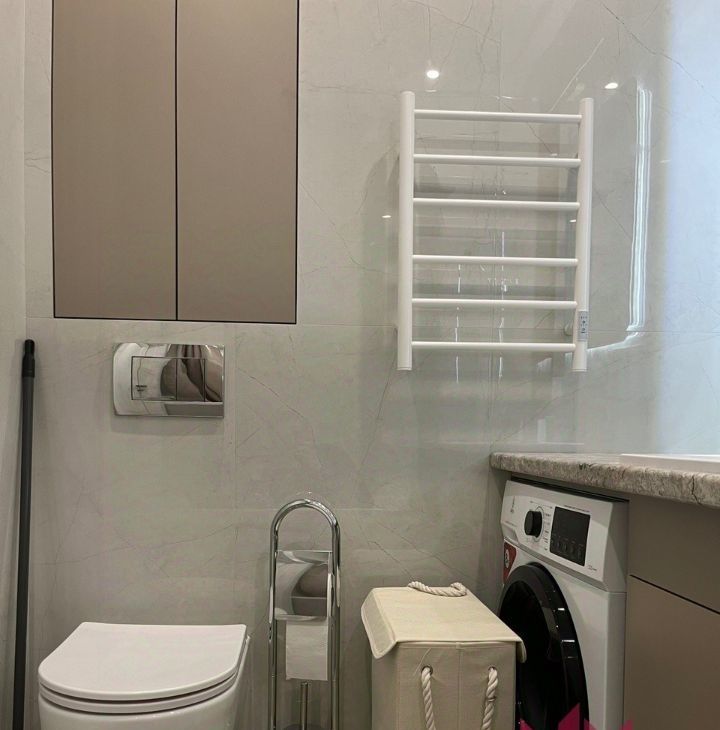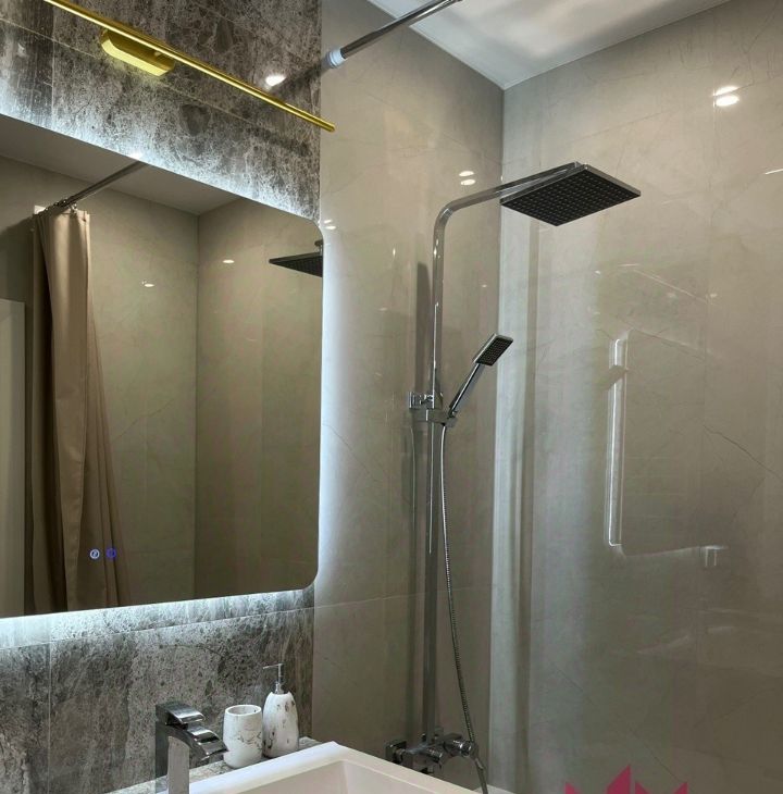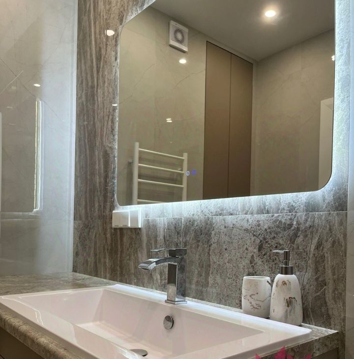Совмещённый санузел оснащён стиральной машиной с функцией сушки, настенным обогревателем, подвесным туалетом, ванной и раковиной с отделкой из камня, большим зеркалом с подсветкой и подогревом.