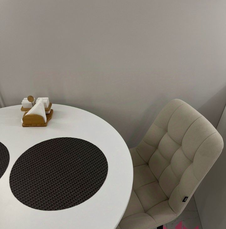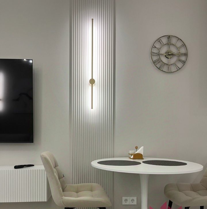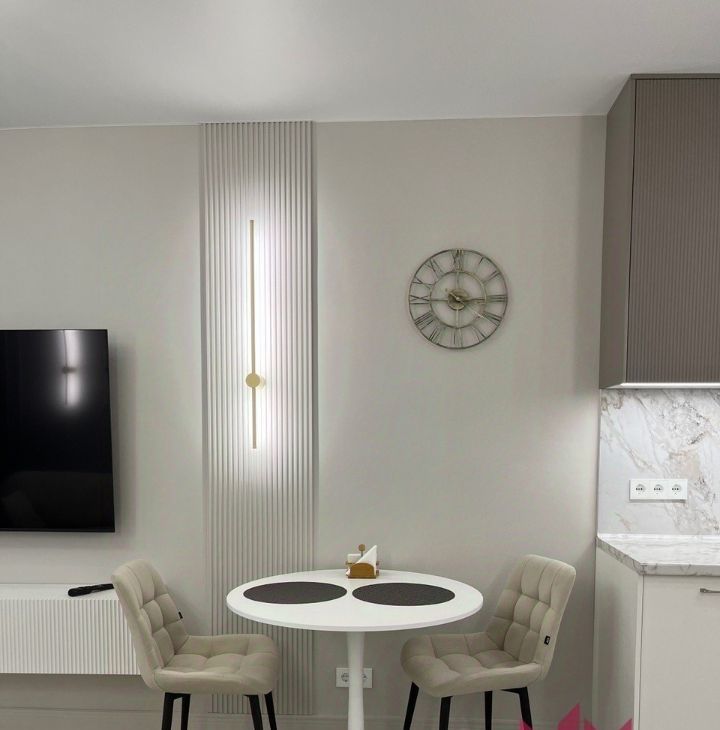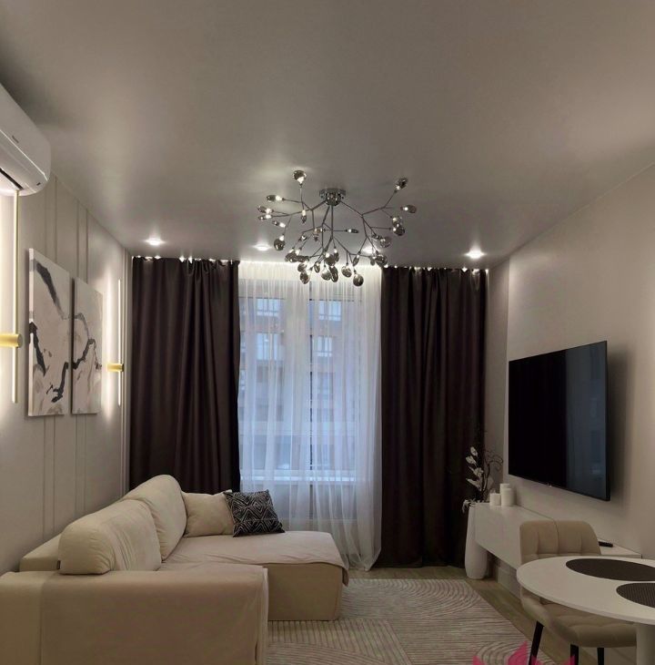 В гостиной предусмотрено удобное обеденное пространство (стол и два стула с обивкой), большой угловой диван, консоль под телевизором и сам телевизор с широкой диагональю. На полу расположился мягкий ковёр, который создаёт уют в пространстве комнаты и делает перемещения по ней ещё более комфортными. Также в гостиной установлен очиститель для воздуха и кондиционер, которые создают собственный чистый микро-климат во всей квартире.