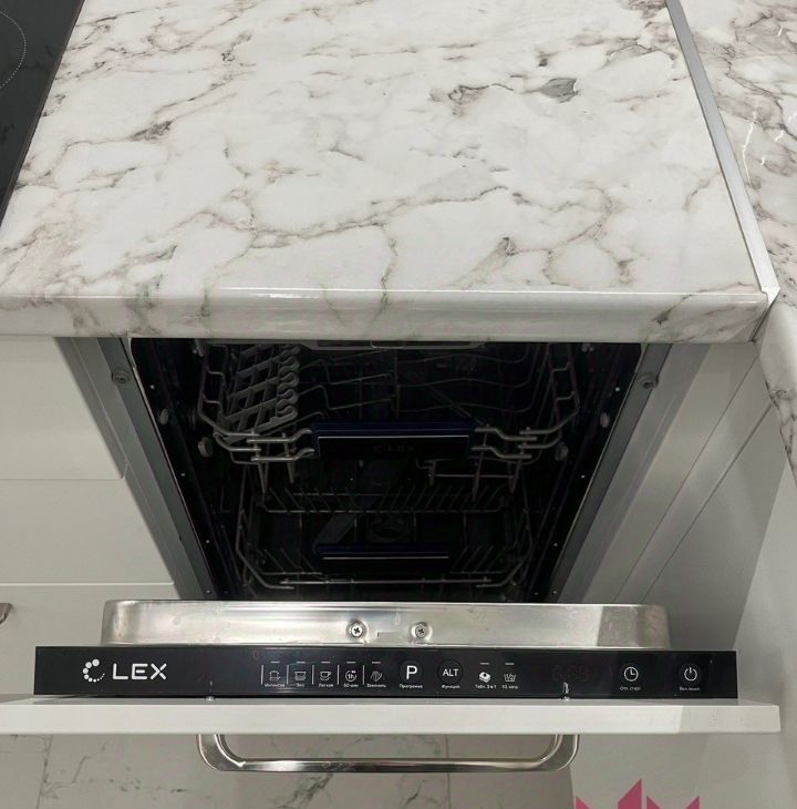 Кухня оснащена вместительным холодильником, духовым шкафом и микроволновой печью, посудомоечной машиной, вытяжкой, а также варочной поверхностью на 4 конфорки и чайником.
