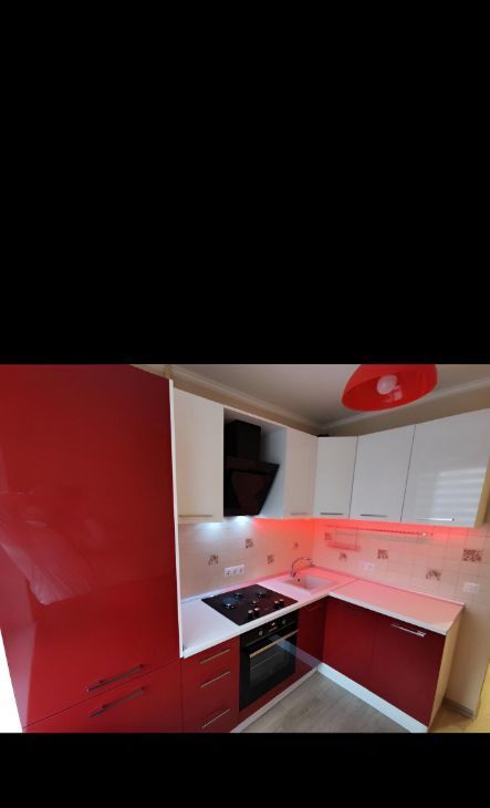 На кухне, кухонный гарнитур с встроенной техникой, холодильник, плита, стиральная машина и т. д. Сдаю на длительный срок.