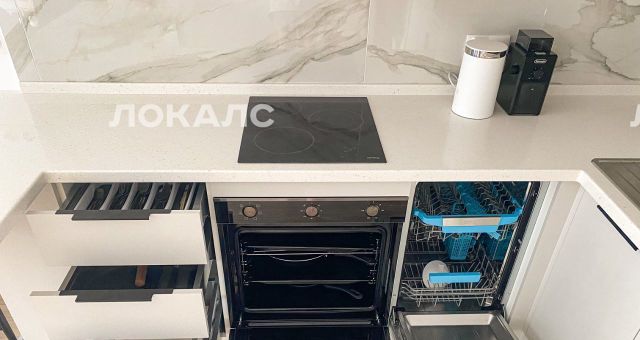 Стиральная и посудомоечная машины, встроенный холодильник, электроплита, духовой шкаф, микроволновка, чайник.