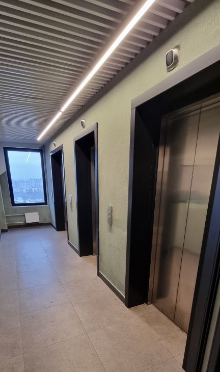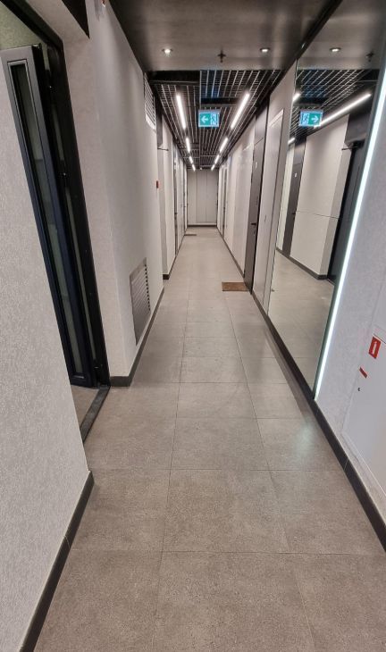 Между квартирами светлые холлы с керамогранитным полом, энергоэффективной подсветкой.