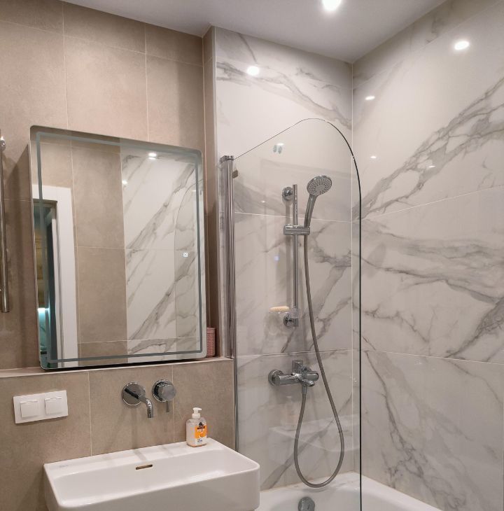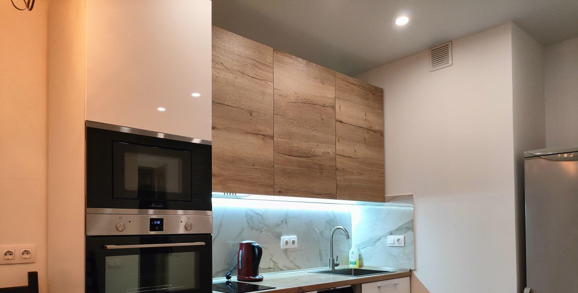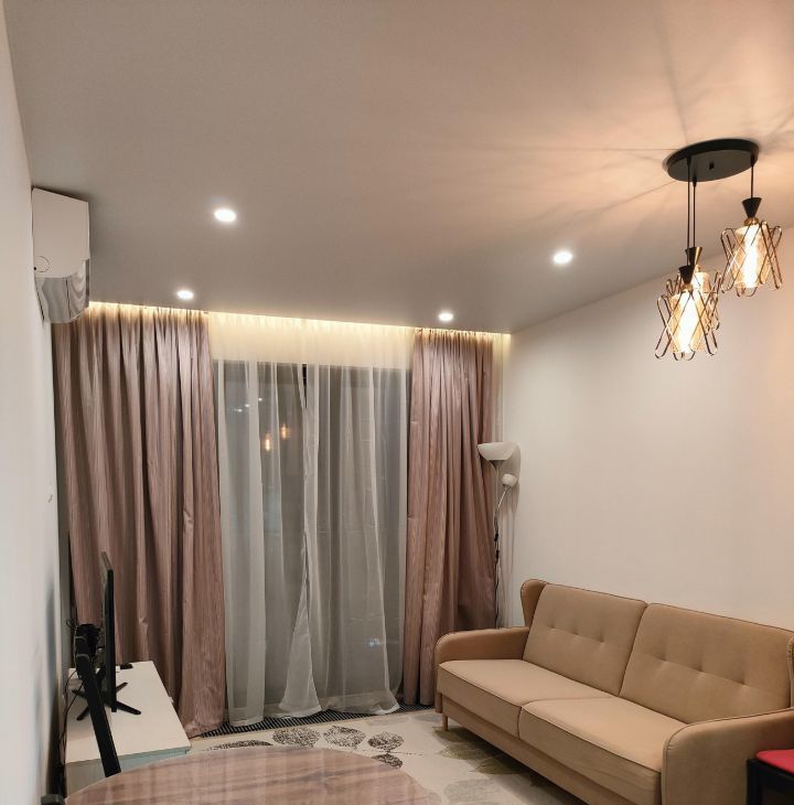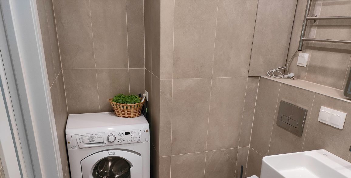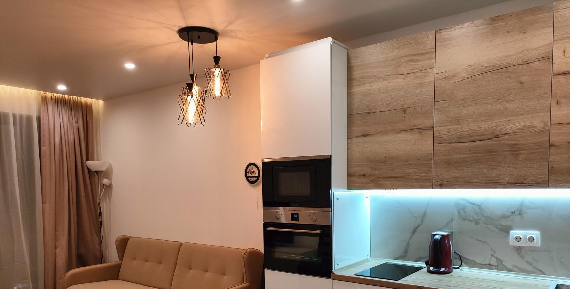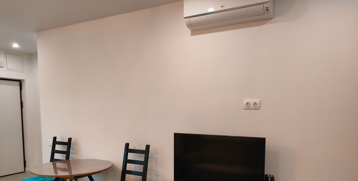 Квартира полностью готова для комфортного проживания. В комнате и на кухне есть вся необходимая мебель. Для вашего удобства установлены кондиционер, холодильник, телевизор, стиральная и посудомоечная машины, микроволновая и духовая печь.