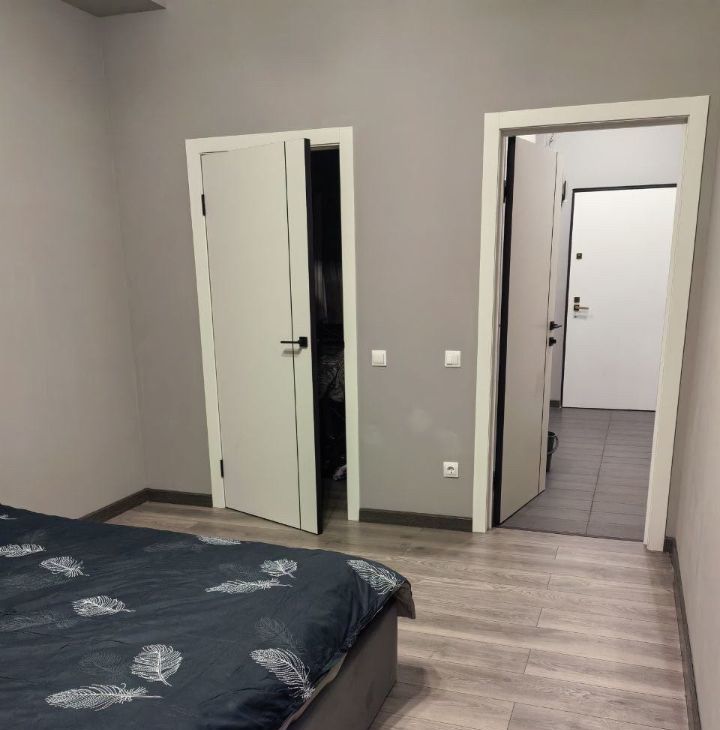 В спальне , кровать и отдельно гардеробная. комната с кухней.