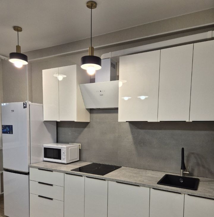 Кухня оборудована всей техникой для комфортного приготовления и употребления вкусной пищи. Холодильник, плита , вытяжка и микроволновка, чайник, кухонный стол со стульями.