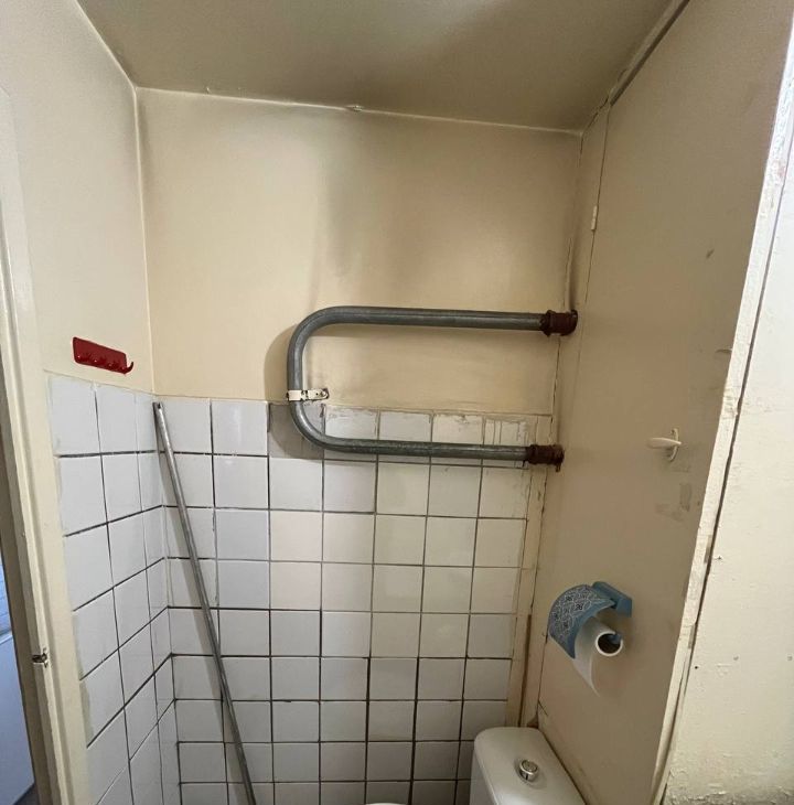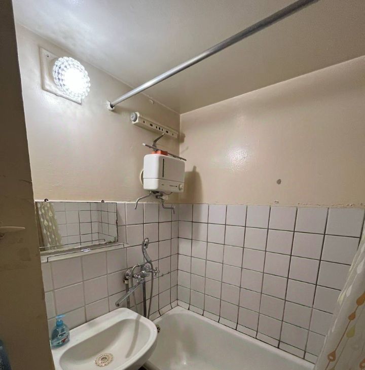 В комнате и на кухне есть вся необходимая мебель и техника: кровать, шкафы для хранения, холодильник и стиральная машина.