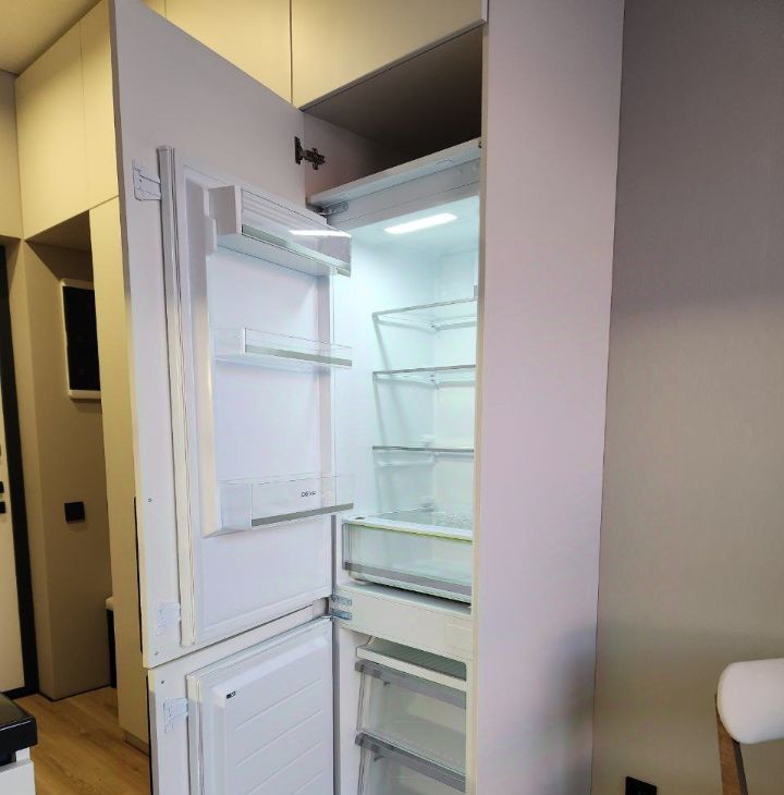 Кухня оборудована современной техникой: встроенный холодильник, индукционная плита, вытяжка, микроволновая печь и посудомоечная машина.