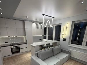 Просторная кухня-гостиная 14 кв.м. ДИЗАЙHEРСKИЙ качественный рeмонт, новая бытовая техника и оборудование ведущих фирм: встроенная индукционная варочная панель, духовой шкаф вытяжка, ПОСУДОМОЕЧНАЯ машина, двухкамерный холодильник, новый большой Smart-телевизор, скоростной Wi-Fi роутер, мощный кондиционер. Многоуровневая подсветка. Натяжные потолки.