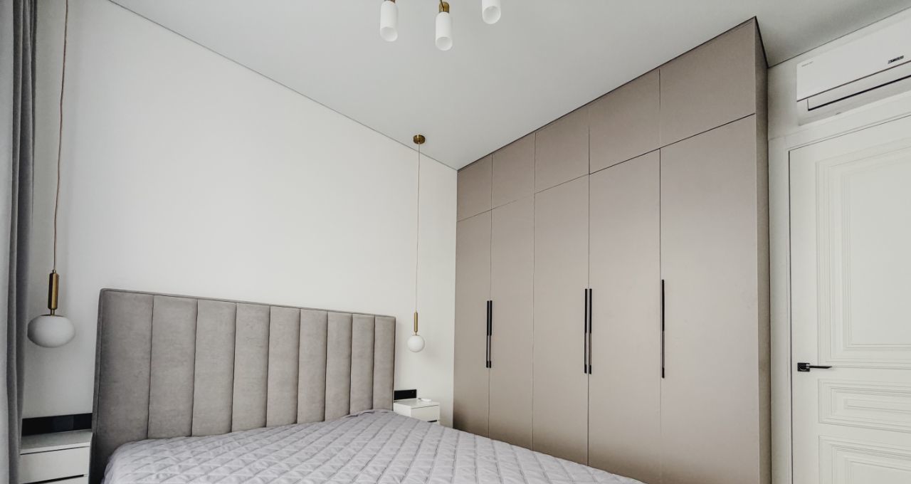 Заходите в спальню и ложитесь на большую кровать с подъемным механизмом для хранения, а также видите шкаф, куда все еще можете убрать свои вещи.