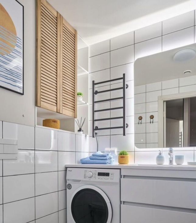 Имеется кондиционер, стиральная машинка, посудомойка, микроволновая печь, варочная панель, телевизор и духовка.