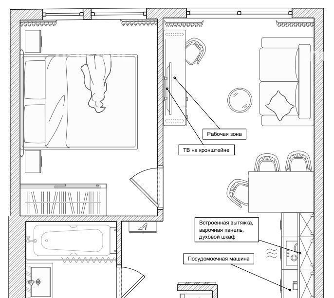 Бытовая тeхника: стиpальнaя машинa, холoдильник, микроволновая печь, варочная панель и вытяжка, посудомоечная машина, телевизор, электрический чайник, кондиционер.