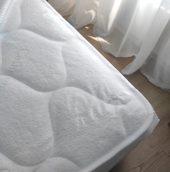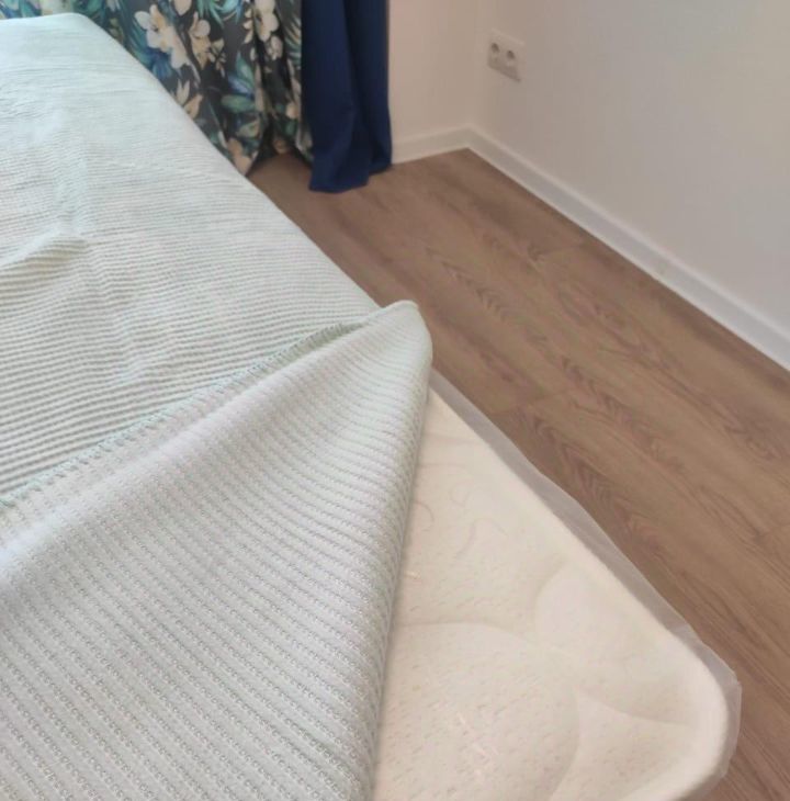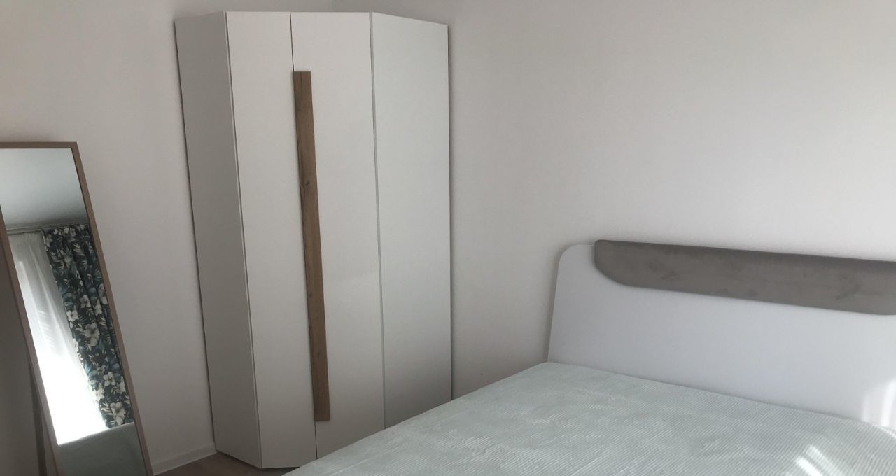 Спальня: двуспальная кровать, ортопедический матрас, угловой шкаф, зеркало.