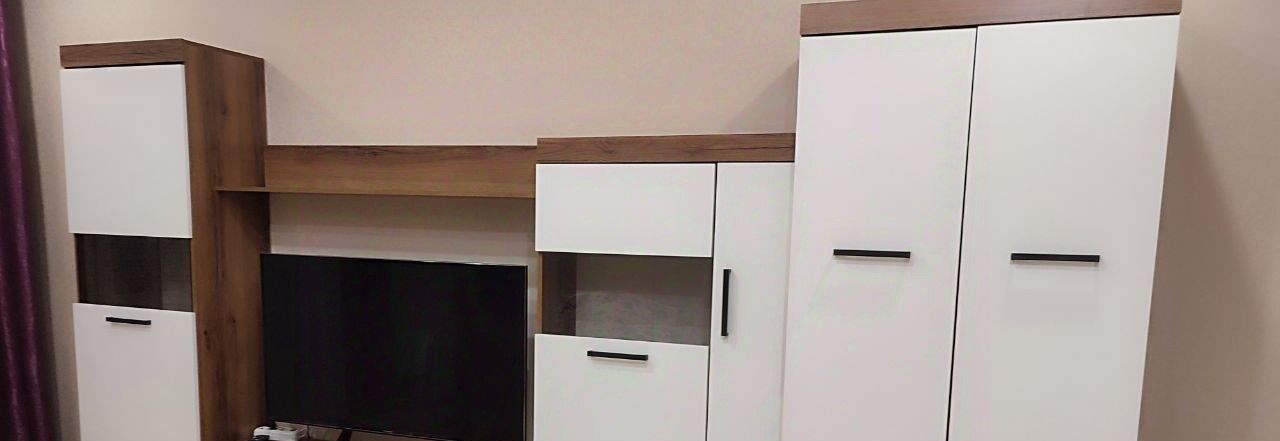 - Мебель: диванкровать, отдельная кровать, новая стенка, обеденная зона, шкаф для одежды в прихожей.