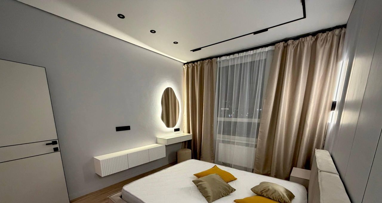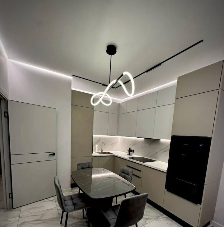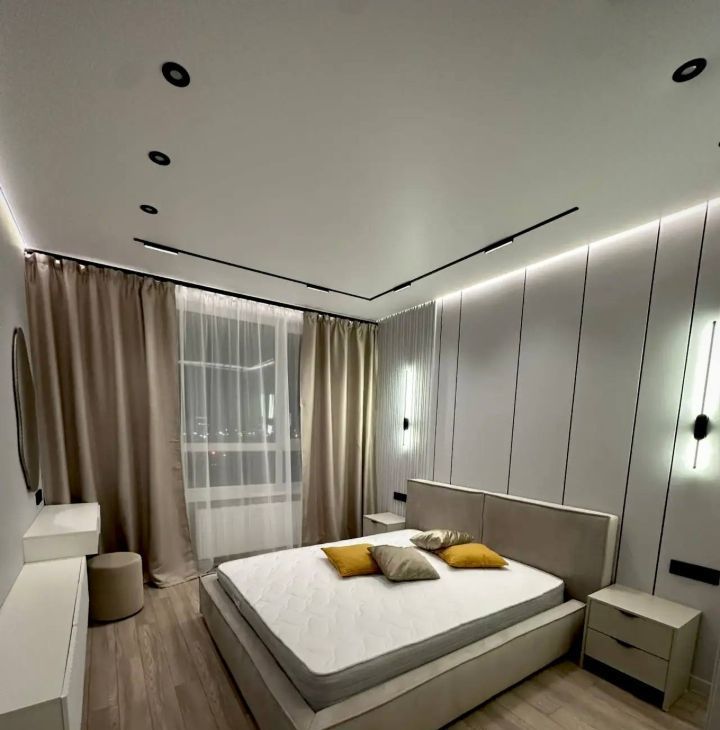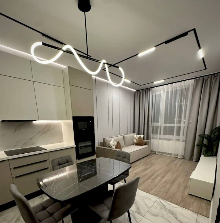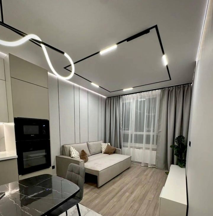 В квартире выполнен дизайнерский ремонт. Потолок и пол дополнительно шумоизолированы. Просторная кухня-гостиная площадью 19 м² оснащена техникой, включая холодильник, духовку, микроволновку и посудомоечную машину. В зоне гостиной установлен телевизор и удобный раскладной диван, как дополнительное спальное место.
