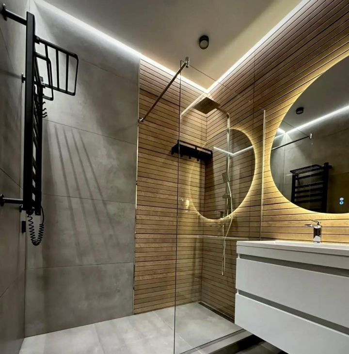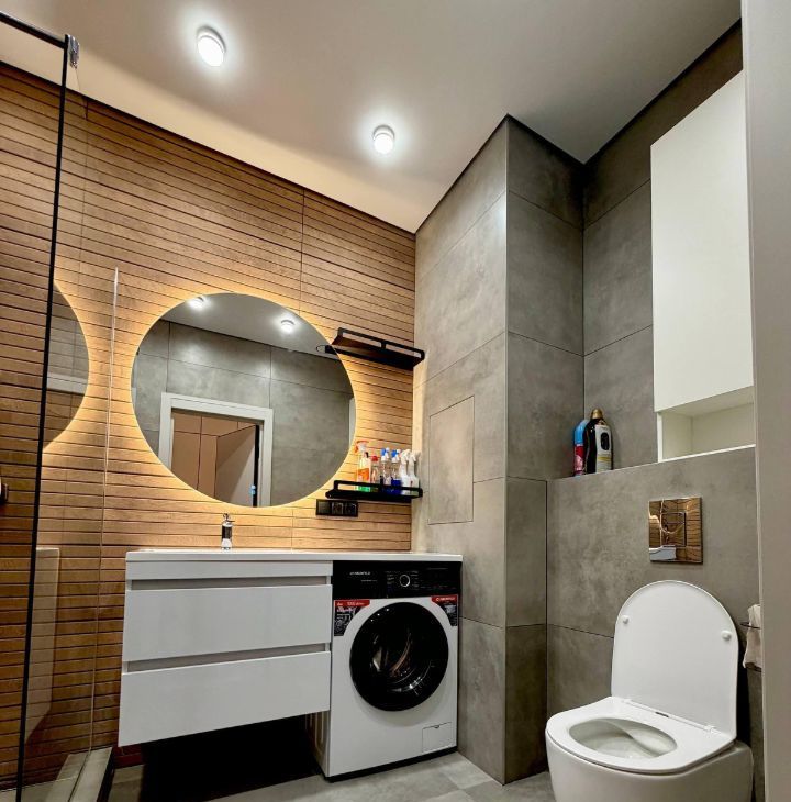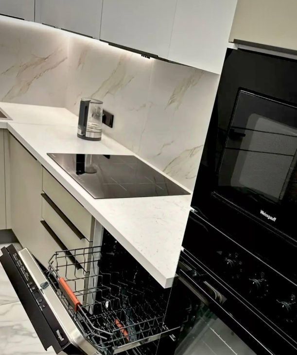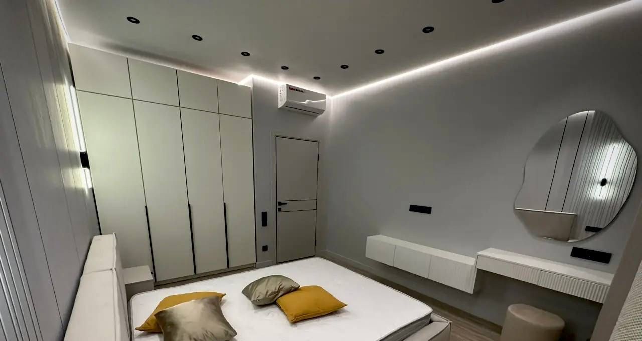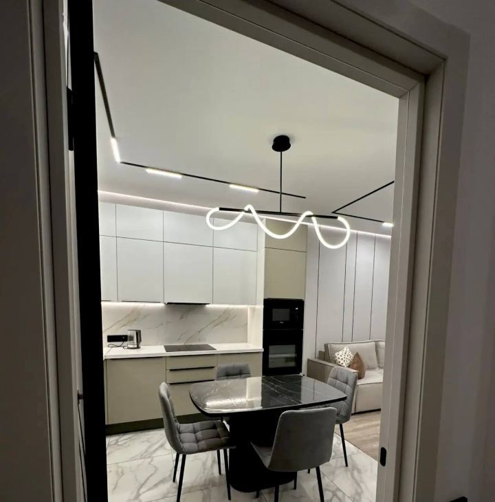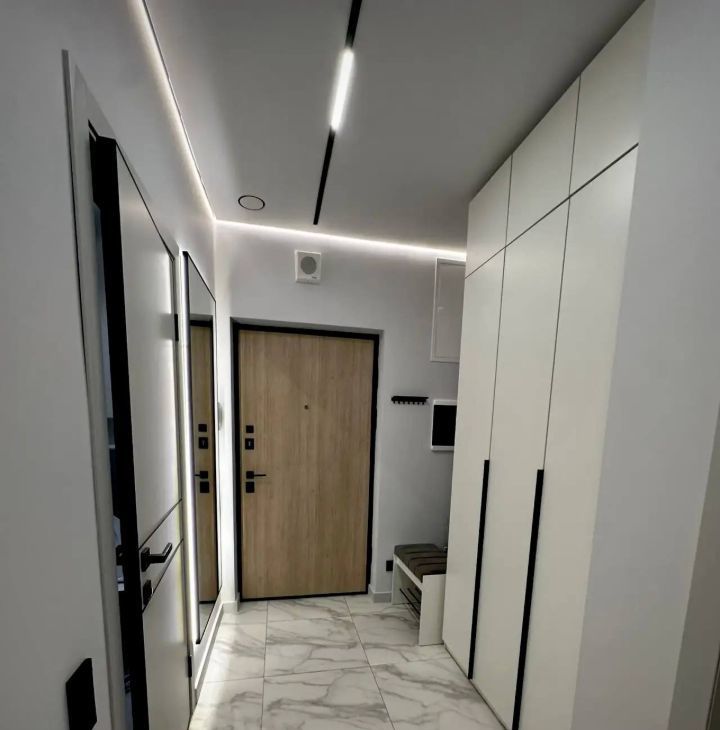 В квартире выполнен дизайнерский ремонт. Потолок и пол дополнительно шумоизолированы. Просторная кухня-гостиная площадью 19 м² оснащена техникой, включая холодильник, духовку, микроволновку и посудомоечную машину. В зоне гостиной установлен телевизор и удобный раскладной диван, как дополнительное спальное место.